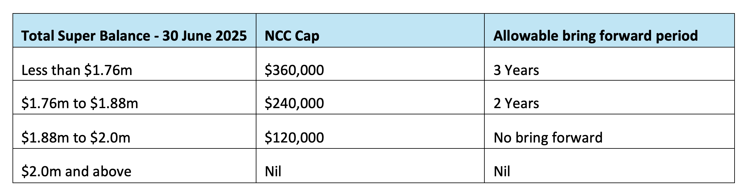 Although the annual NCC cap has not changed, NCCs can now be made by individuals with a total super balance (TSB) of less than $2,000,000 on 30 June 2025 (assuming they have not reached the age 75 deadline and any prior bring forward periods are considered). This is due to the fact that the upper TSB limit links to the general transfer balance cap (TBC) which has increased to $2,000,000.