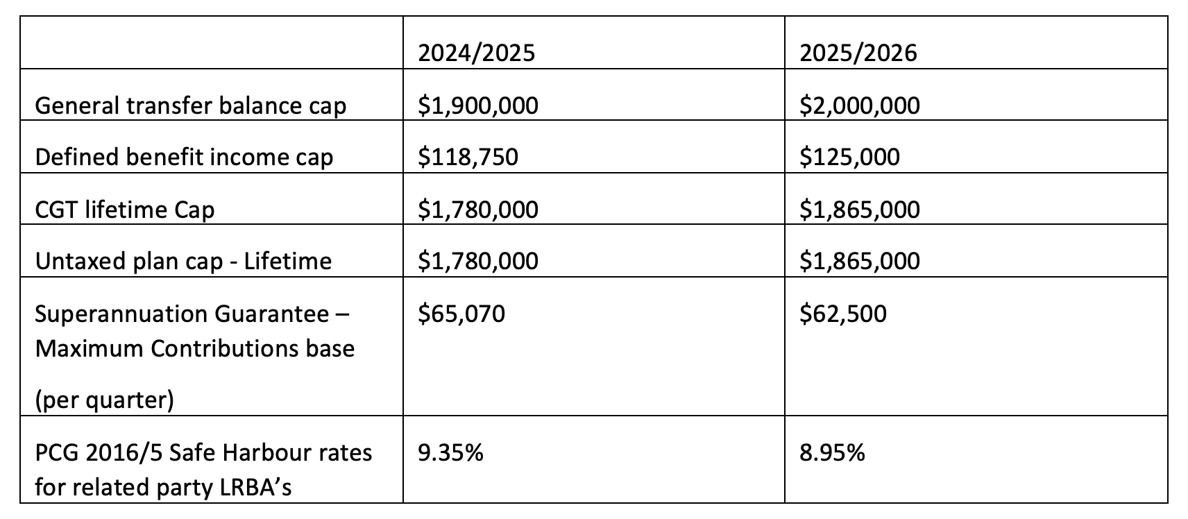 Updated superannuation and tax thresholds: key updates to contribution caps, CGT contribution limits, and safe harbour interest rates