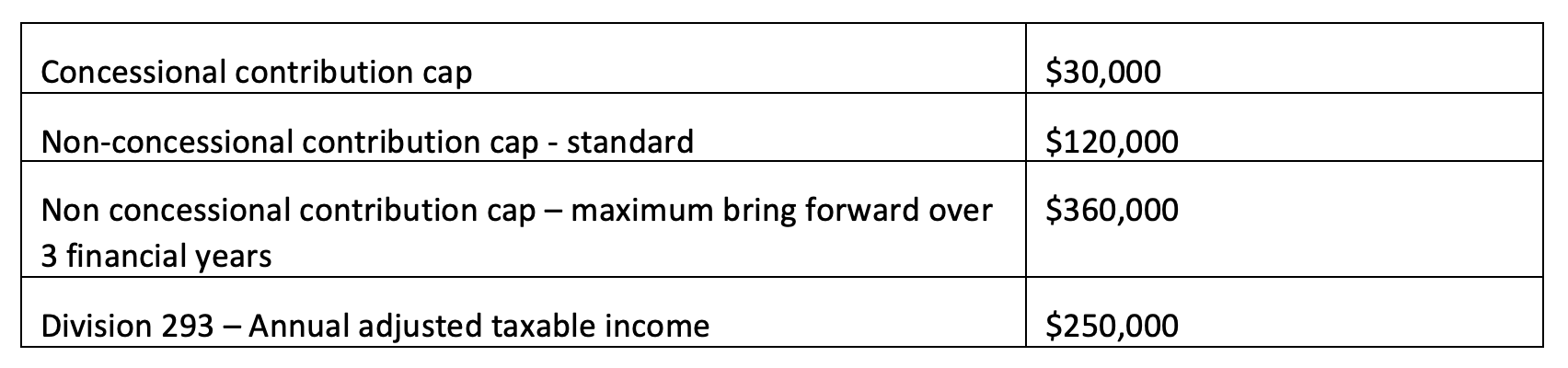 The annual concessional contribution cap will remain at $30,000 for the 2025/2026 financial year. The annual non-concessional contribution (NCC) cap is set at four times the concessional contribution cap meaning it will also remain at $120,000.